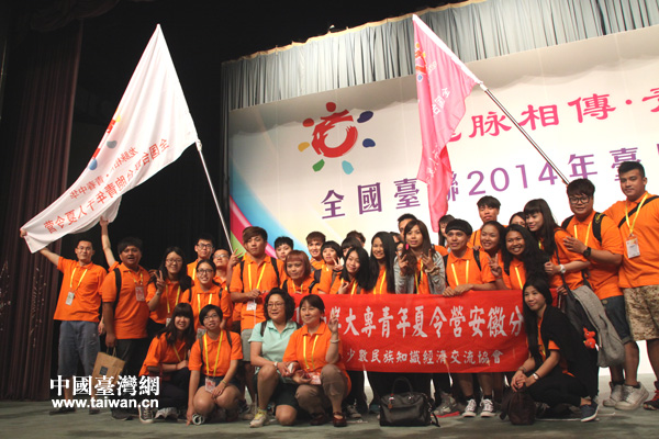 4日上午,全國臺聯2014年臺胞青年千人夏令營開營儀式在北京國際會議中心舉行。圖為臺灣青年在開營儀式后合影留念。(中國臺灣網 李徽 攝)