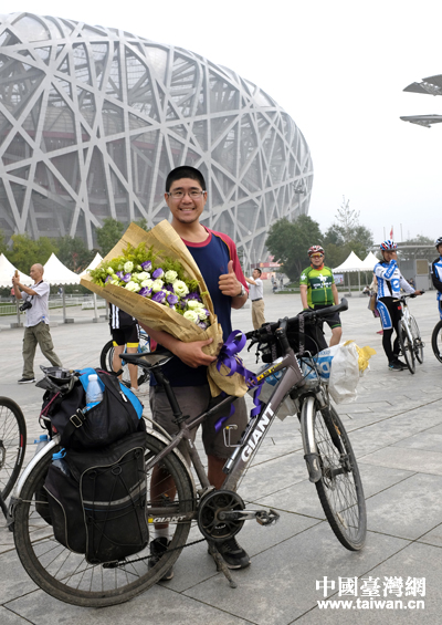 24日下午,臺灣青年騰飛達的“絲綢之路——馬可波羅騎行之旅”在抵達國家體育場后畫上圓滿句號。(中國臺灣網 普燕 攝)