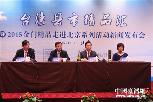 中國臺灣網12月15日北京訊 (記者 郜利敏)今日下午,“臺灣縣市精品匯暨2015·金門精品走進北京系列活動”新聞發布會在北京臺灣會館舉行。北京市臺聯黨組書記王蘭棟、副會長鄭大、金門縣長陳福海等出席發布會。