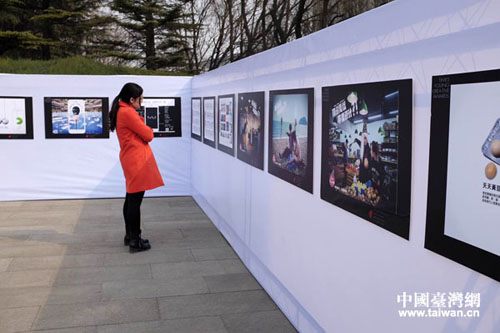 校園外有同學在觀看往屆大賽獲獎作品。(中國臺灣網 普燕 攝)