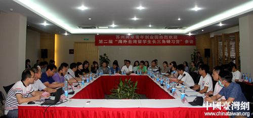 第二屆“海外臺灣留學生長三角研習營”營員參訪了位于蘇州吳中區木瀆鎮的兩岸青年創業園,并與當地領導、專家以及園內臺青企業代表座談。(中國臺灣網記者 李杰 攝)