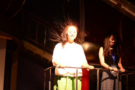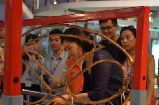 同時(shí),記者們?cè)诨?dòng)區(qū)也親身上陣體驗(yàn)了不同的互動(dòng)環(huán)節(jié):360度旋轉(zhuǎn)的模擬翻車,會(huì)跳騎馬舞的智能機(jī)器人、親身上陣感受宇航員進(jìn)行三維環(huán)滾訓(xùn)練、神奇的隱身屋、電磁舞臺(tái)的怒發(fā)沖冠……在廣東科學(xué)中心的游覽不僅僅是一場(chǎng)知識(shí)與趣味的完美結(jié)合,同時(shí)也將生活中大大小小的原理以生動(dòng)有趣的形式讓觀者親身體驗(yàn)。