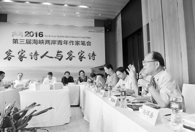 本報記者 (張永定 陳夢婕 文/圖) 3日在福州開幕的第三屆海峽兩岸青年作家筆會上,來自海峽兩岸的30多位作家和文學研究者聚集一堂,圍繞“客家詩人與客家詩”的主題展開研討(如圖)。
