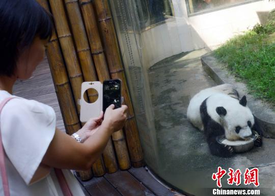 當天,參加第十三屆榕臺青年夏令營的40位臺灣青年學生來到海峽(福州)大熊貓研究交流中心,與生活在這里的35歲高齡明星熊貓“巴斯”等大熊貓“親密”接觸。