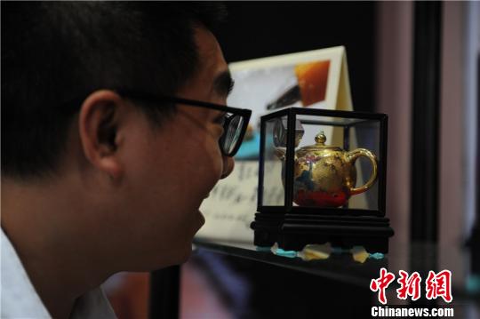 此次帶來的26件作品包括陶瓷、鑲金、翡翠材質做的微雕茶壺和酒壺造型等。比水滴還小的陶瓷酒壺、不足0.3厘米的黃金酒壺,0.2厘米大小的翡翠酒壺,除了這些放在針孔上還能“排排站”的小酒壺,還有頭發上雕刻的熊貓、火材棒上寫詩、南瓜子上的百壽圖等。