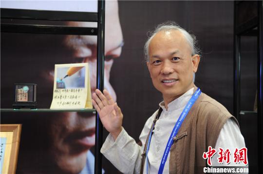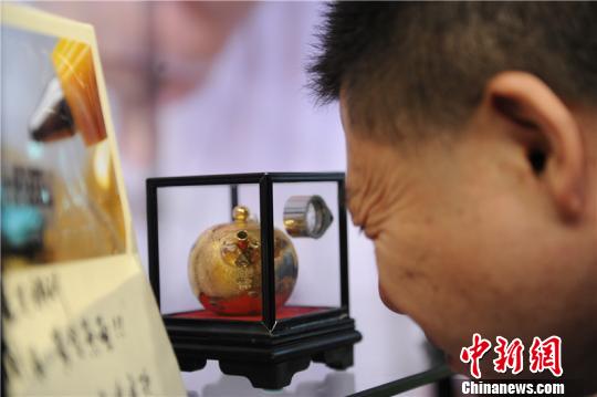 第六屆中國(貴州)國際酒類博覽會酒類產品衍生館內,微雕大師陳逢顯介紹其微雕作品。 賀俊怡 攝