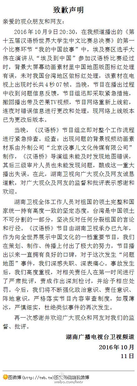 10 月11日晚,湖南衛視官方微博發布致歉聲明,稱《漢語橋》節目組對整個工作流程進行緊急排查,經查:出現問題的背景視頻動畫素材系由外制公司“北京沒事兒 文化傳媒有限公司”制作,《漢語橋》導演組未能及時發現地圖錯誤,其后三級審片人員也未能發現問題,釀成這一重大播出失誤。在此,湖南衛視向廣大觀眾及網 友誠懇道歉,對廣大觀眾及網友的監督和批評表示感謝和歡迎。以下為致歉聲明全文:
