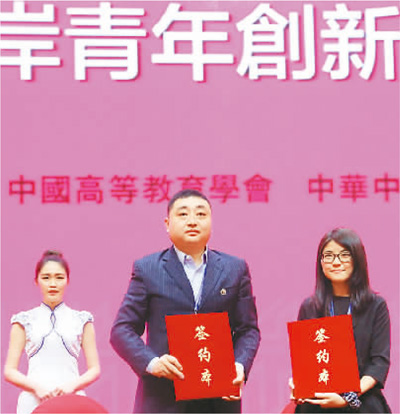 臺灣藝術大學學生施乃文(右)與大陸企業(yè)簽約,她的作品將進入大陸市場。