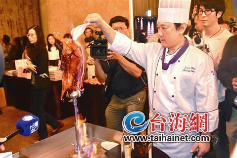 有意思的是,活動現(xiàn)場一邊是“理論派”美食家侃侃而談,一邊是大廚或商家們展示各地創(chuàng)意美食。臺灣君品酒店副主廚簡敏宏現(xiàn)場展示了火焰片皮鴨的制作,當(dāng)鴨子淋上君度橙酒點(diǎn)燃跳躍著藍(lán)色火光時(shí),全新視覺體驗(yàn),引發(fā)陣陣贊嘆聲。