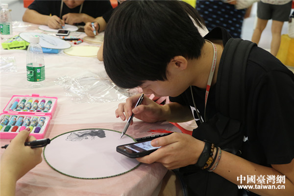 在首博的互動教室,兩岸青年正在體驗手繪扇面。圖為臺灣中華科技大學大一學生劉立禾。(中國臺灣網 郜利敏 攝)