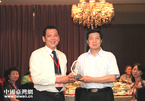 臺灣中華兩岸婚姻協調促進會理事長鐘錦明(左)向省臺辦副主任周越明贈送紀念品。(云南省臺辦 李仁興 攝)