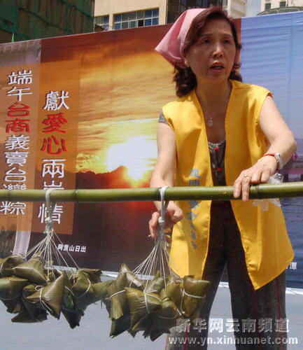 6月18日,一位臺商在義賣粽子。 當日,端午節(jié)臺商義賣粽子活動在昆明舉行,幾十位臺商將自己制作的600盒臺灣風味粽子義賣,并將義賣所得的3萬多元捐贈給云南寧洱地震災區(qū)。 新華社記者 蔡祥榮 攝