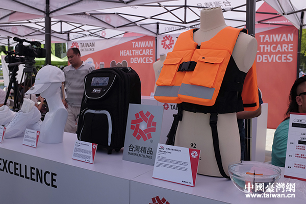 現場展品包括世界首創展開式浮水衣(右一)等。(中國臺灣網 普燕 攝)