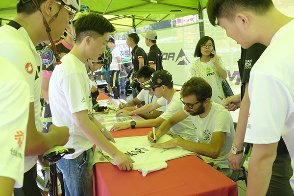 臺灣貿易中心與臺灣精品廠商美利達聯合主辦的2015“臺灣精品美利達杯”國際自行車賽也在同期舉行。臺灣一哥馮俊凱、電影《破風》中的香港演員陳家樂一并亮相開幕式并為粉絲們簽名。(中國臺灣網 普燕 攝)