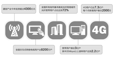 苗圩介紹說,今年,通信產業完成投資超過4300億元,全國所有地市基本建成光纖網絡城市,光纖寬帶用戶占比達到72%,4G用戶突破7億戶,全國IPTV(交互式網絡電視)用戶已達8200萬戶;全國固定寬帶平均接入速率達到2015年的2倍;新增3個互聯網骨干直連點,網間帶寬新擴容950G。