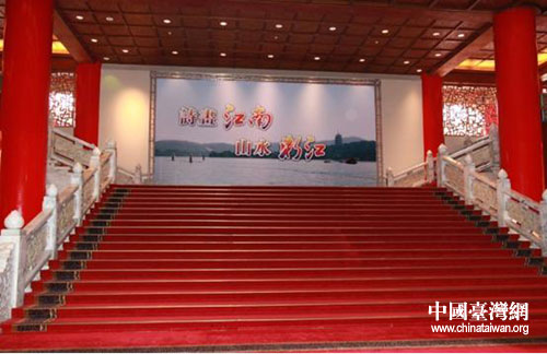 圓山飯店大堂內巨大的“詩畫江南,山水浙江”背景板。(浙江省臺辦王健 攝)