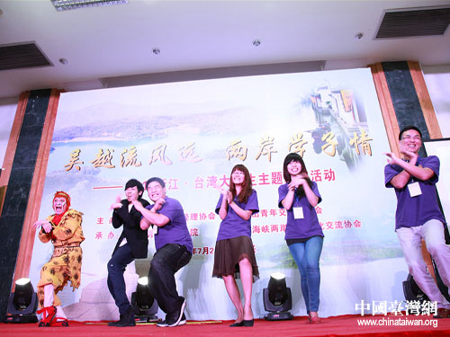在舞臺(tái)上,兩岸學(xué)生留下了他們的汗水、掌聲,收獲了快樂與友誼。以實(shí)習(xí)地為單位的團(tuán)隊(duì)表演,讓兩岸學(xué)生在表演中充滿了競(jìng)爭的火熱,在紹興實(shí)習(xí)的臺(tái)灣大學(xué)生團(tuán)隊(duì)表演的《管他什么愛情之陸游與唐琬的扇子》充滿“笑果”的表演與激情大喊:“最美的愛情在紹興。”的橋段,讓兩岸學(xué)生笑成一片, 當(dāng)兩岸學(xué)生合唱歌曲龍的傳人的時(shí)候,更是引爆全場(chǎng),全場(chǎng)學(xué)生自動(dòng)起立,大家肩并肩、手牽手,激動(dòng)揮舞,拉出一波波人浪,齊聲合唱著:“黑眼睛 黑頭發(fā)黃皮膚 永永遠(yuǎn)遠(yuǎn)是龍的傳人”。活動(dòng)后,兩岸學(xué)生紛紛合影留戀。