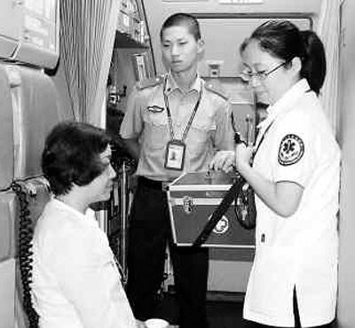 7月20日晚,由香港飛往杭州的MU961航班備降溫州機場,機上有位60多歲的臺胞黃女士心臟病突發,溫州機場邊檢站立即請來醫務人員對該旅客進行了檢查治療。圖為醫務人員為患病臺胞黃女士(左一)治療。羅文欽 姚海平攝