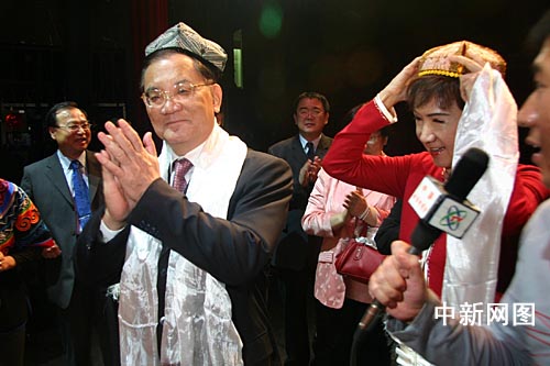 中國國民黨榮譽主席連戰(中)和其夫人連方瑀二十三日晚間在臺北“國父紀念館”觀看完中央民族歌舞團大型原創歌舞《天地祥云》后,走上舞臺,祝賀首場演出取得圓滿成功。 徐長安 攝
