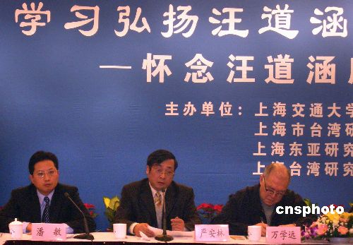 一年前的十二月二十四日,海協會會長汪道涵在上海逝世。十二月二十二日,大陸各界人士聚會汪老母校上海交通大學,舉行“懷念汪道涵”座談會。來自上海東亞研究所、上海臺灣研究所等機構的學者發言,汪道涵親屬汪靜夫婦等與會。 中新社發 許曉青 攝