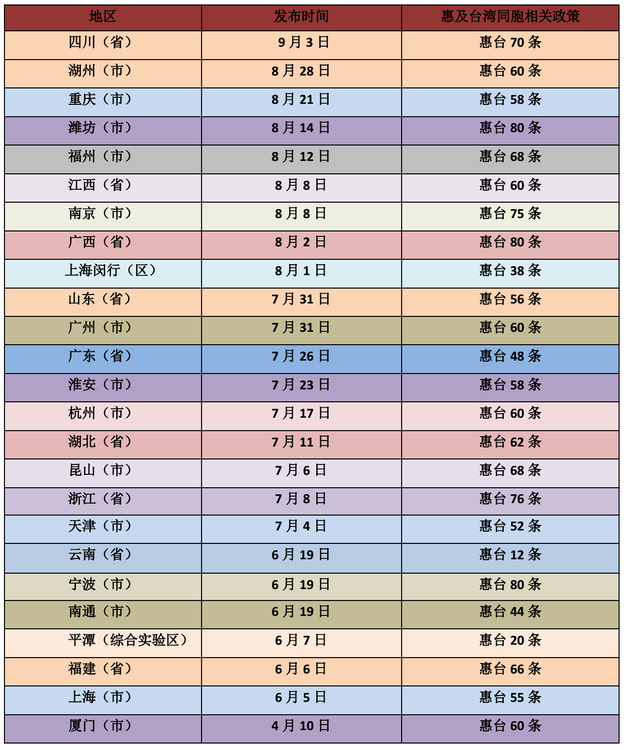 這些省市結(jié)合自身優(yōu)勢特色,針對本地臺胞臺企的特點和需求,出臺惠及臺灣同胞的相關(guān)政策措施,可謂是“量身定制”。這些政策涉及領(lǐng)域從創(chuàng)業(yè)、就業(yè)、學習到生活,其中不乏有亮點顯現(xiàn)。點擊政策名稱,可以鏈接到政策全文喲!
