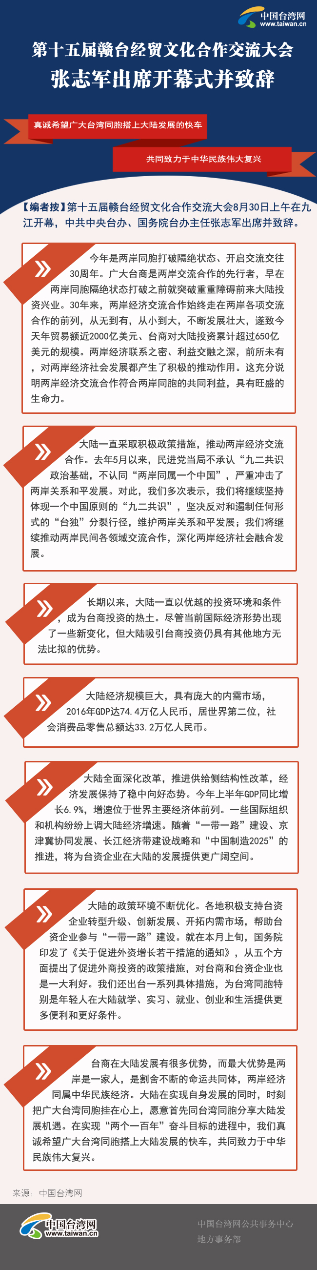 “江西逐漸成為臺商投資興業和承接東部臺資企業轉移的新高地”——中共中央臺辦、國務院臺辦主任張志軍:2003年以來,在江西省委、省政府的高度重視下,贛臺會已成功舉辦了十四屆,達成了諸多兩地合作項目和共識,成為大陸中部地區對臺經貿文化交流合作的重要平臺,為促進兩岸經濟社會發展、密切兩岸各界關系、增進民眾福祉作出了積極貢獻。江西是“長珠閩”的直接腹地,處于國家“一帶一路”和長江經濟帶戰略交匯點,區位優勢明顯、戰略平臺疊加、生態環境優良,發展勢頭強勁。長期以來,江西省各級黨委、政府高度重視推動贛臺交流合作,大力開展對臺招商引資,切實為臺商、臺企排憂解難,依法保護臺商投資權益,贏得臺商的廣泛信賴和贊譽,江西也逐漸成為臺商投資興業和承接東部臺資企業轉移的新高地。希望廣大臺商抓住中部崛起等重大戰略實施的機遇,積極參與大陸“一帶一路”、長江經濟帶建設,在合作雙贏中實現企業自身的發展壯大。中央臺辦、國務院臺辦將一如既往支持江西在深化兩岸交流合作中發揮更大的作用。