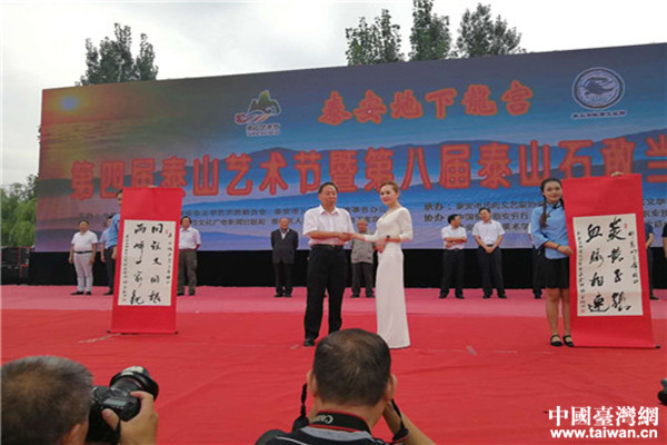 中國臺灣網9月7日泰安訊 9月5日上午,第四屆泰山藝術節暨第八屆“海峽兩岸泰山石敢當文化節”在山東省泰安地下龍宮景區開幕。山東省臺辦交流處副處長魏章柱、中國書法家協會藝術發展中心原常務副主任楊墨純、泰安市人大常委會副主任曹步山、副市長成麗、臺灣中華海峽兩岸交流促進會理事長李妮、臺灣中國藝術協會副會長蔡豐名等參加了開幕式。