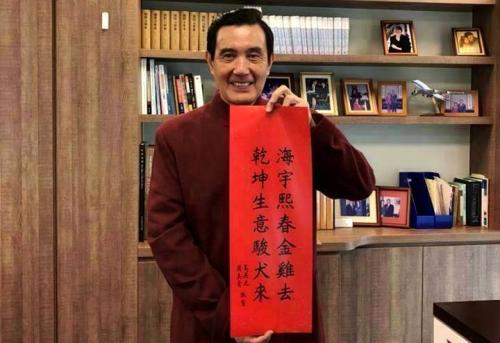 馬英九今年的春聯(lián)“海宇熙春金雞去,乾坤生意駿犬來”。(圖片來源:臺灣《聯(lián)合報》)
