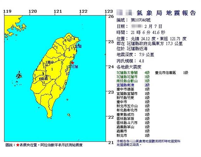 21時06分,花蓮縣近海發生規模4.8級有感地震,深度7.9公里,花蓮最大震度4級、宜蘭2級。(圖片來源:臺灣《中時電子報》)