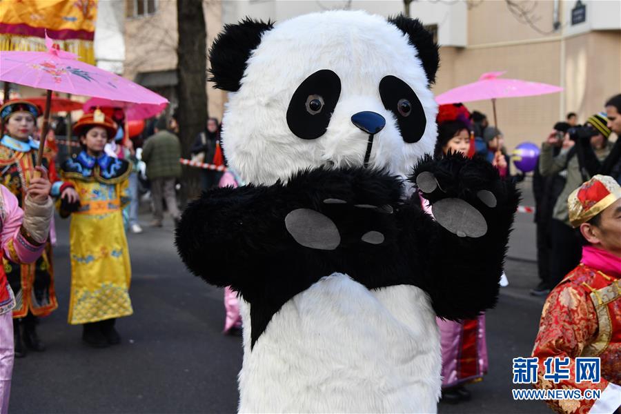 2月25日,在法國巴黎,大熊貓造型人偶參加春節(jié)彩妝大游行。當日,法國華人舉行春節(jié)彩妝大游行,慶祝中國農歷狗年的到來。新華社發(fā)(杰克·陳 攝)