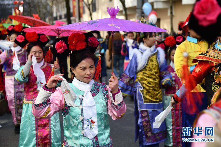 2月25日,在法國巴黎,“財神”在春節(jié)彩妝大游行中行進。新華社發(fā)(杰克·陳 攝)
