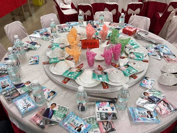 網(wǎng)友出席宴請,看見餐桌上擺滿市議員候選人的競選面紙和礦泉水,讓他非常傻眼。(圖片來自臺媒)
