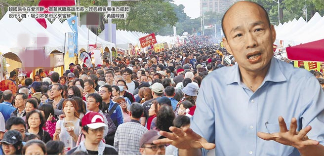 韓國瑜今在愛河畔宣誓就職高雄市長,昨典禮會場后方擺起夜市小攤,吸引眾多市民嘗鮮。(圖片來源:臺灣“中時電子報”)