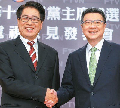 民進黨黨主席補選昨天舉行電視政見發表會,候選人卓榮泰(右)和游盈隆(左)先握手致意。(圖片來源:臺灣《聯合報》)
