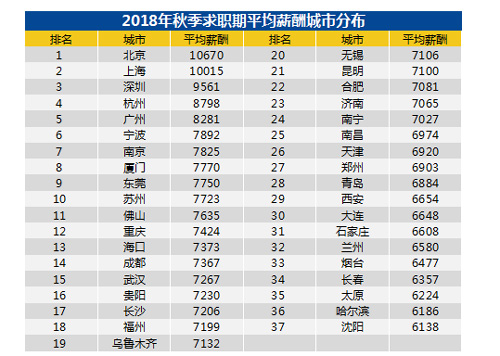 數據顯示,全國37個主要城市的平均招聘薪酬為7850元,本季度平均薪酬環比上升0.2%,同比漲幅為3.3%。從城市看,北上廣深等一線城市依然排名靠前。與上季度對比,大部分城市的薪酬水平小幅上升,前六名中僅有寧波的薪酬水平較上一季度有所下降。與上一季度相比,南京和廈門的薪酬水平及排名均有小幅上升,東莞的薪酬水平和排名均有所下降。