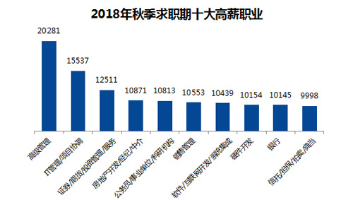 從不同職業的薪酬水平來看,2018年秋季求職期薪酬水平排名前十的職業中,高級管理仍然位列十大高薪職業榜首,以20281元的高薪繼續領跑其他職業。管理人才作為各行業搶奪的重磅角色,長期處于相對較高的薪酬水平,證券/期貨/投資管理/服務的薪酬水平上升,以12511的薪酬排名第三位。