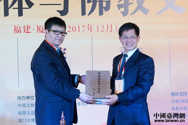 九州音像出版公司副總裁冀小東先生為中華慈濟大學贈《中化佛教文化年鑒》。(中國臺灣網 張玲 攝)