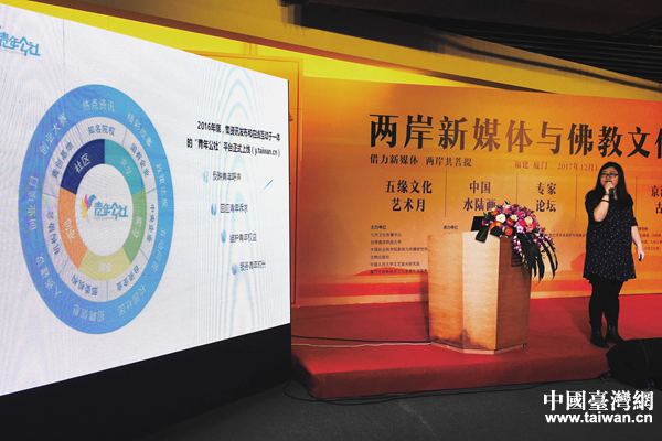 兩岸嘉賓圍繞“兩岸新媒體與佛教文化論壇之兩岸佛教文化的新媒體表達”和“兩岸新媒體與佛教文化論壇之青年公社打拼兩岸文化原創力”兩大專題進行了深入的探討和交流,圍繞新時代、新媒體視角下佛教文化傳播的轉型升級,青年參與兩岸文化原創力的創新趨勢等發表主題演講。其中,中國臺灣網記者張玲介紹了兩岸青年交流平臺“青年公社”。