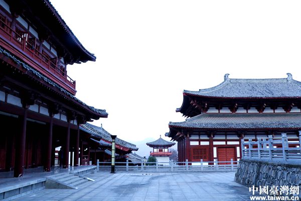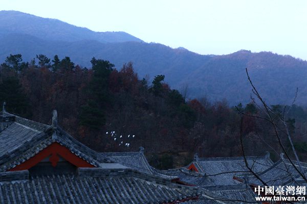 兩岸人士參觀佛教學(xué)院,學(xué)院巖壁上成群白鴿飛過。(中國臺(tái)灣網(wǎng) 盧佳靜 攝)