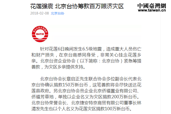 “花蓮6日晚間發生6.5級地震,造成重大人員傷亡和財產損失,在京臺商感同身受,非常關心掛念花蓮鄉親。”北京臺資企業協會(以下簡稱“北京臺協”)8日在微信公眾號上宣布,北京臺協會長章啟正先生聯合協會多位副會長代表北京臺協確認捐款150萬新臺幣,這筆善款將會盡快送達花蓮縣政府。另北京臺協會員企業北京僑福置業有限公司、僑福芳草地,單獨以企業名義為災區捐款200萬新臺幣。北京臺協榮譽會長、北京捷安特京商貿有限公司董事長林清發先生也以個人名義為花蓮災區捐款100萬新臺幣。