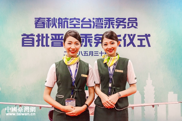 中國臺灣網5月30日上海訊 5月30日,春秋航空公司的兩位臺灣乘務員葉宇晴、黃佳瑩通過晉級考核,晉升為乘務長,她們也成為了大陸首批臺灣乘務長,當天分別率乘務組執飛上海至西安、石家莊航班。春秋航空表示,上海日益成為了臺灣青年第二個家,這是滬臺進一步交流合作結下的碩果,春秋航空將一如既往地打造兩岸青年交流合作平臺,歡迎臺灣青年在大陸就業、生活。