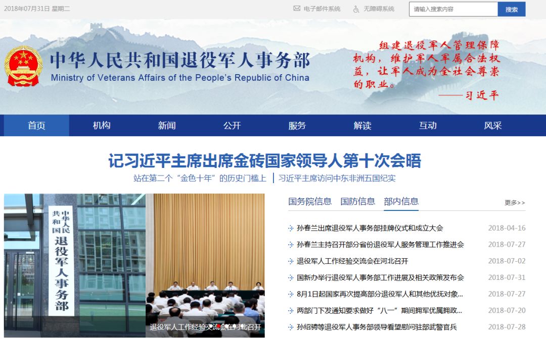 中華人民共和國退役軍人事務(wù)部門戶網(wǎng)站于7月31日上線運行,網(wǎng)址為www.mva.gov.cn。網(wǎng)站開設(shè)機構(gòu)、新聞、公開、服務(wù)、解讀、互動、風(fēng)采等頻道,秉承“維護軍人軍屬合法權(quán)益,讓軍人成為全社會尊崇的職業(yè)”這一宗旨,向全社會宣傳退役軍人為黨、國家和人民犧牲奉獻的精神風(fēng)范和價值導(dǎo)向,提供“互聯(lián)網(wǎng)+退役軍人服務(wù)”,打造退役軍人工作信息公開、政策發(fā)布解讀和及時回應(yīng)關(guān)切的第一平臺。