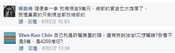 還有網友表示,9萬新臺幣真的不多,比起蔡英文“騙”老百姓的8800億(新臺幣)。