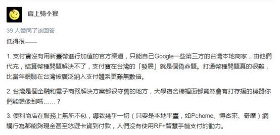 更有網(wǎng)友直言:臺灣是個金融和電子商務(wù)解決方案都很守舊的地方,支付寶想在臺灣發(fā)展根本就是個偽命題。