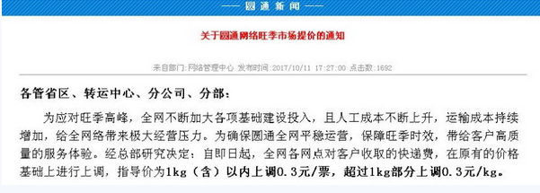 媒體報(bào)道的,圓通早前掛出的漲價(jià)通知