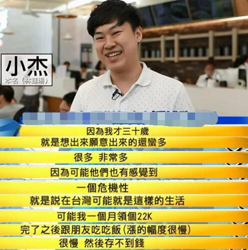 據“yes123求職網”發言人楊宗斌表示,對30多歲的臺灣青年勞工來說,月薪還不到3萬元,“前途”、“錢途”皆茫然;而40歲以下的勞工自認是“月光族”的比例高達1/3,其余66%的人,平均每月僅存8814元。