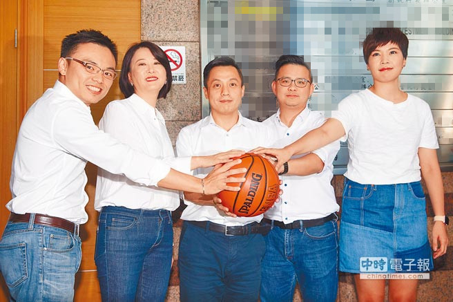 國民黨發(fā)言人1日亮相,文傳會(huì)義務(wù)副主委洪孟楷(左起)、臺(tái)北市議員王鴻薇、文傳會(huì)主委李明賢、新媒體部主任黃健豪、新任文傳會(huì)副主委兼文宣部主任鐘沛君共同拿籃球,高喊“重返執(zhí)政,國民黨加油”,希望2018地方選舉投“藍(lán)”成功。(圖片來源:臺(tái)灣《中時(shí)電子報(bào)》)