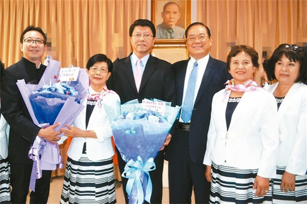 國民黨臺(tái)南市黨部舉行新舊任主委交接典禮,黨員獻(xiàn)花祝福新主委謝龍介(右四)。(圖片來源:臺(tái)灣《聯(lián)合報(bào)》)