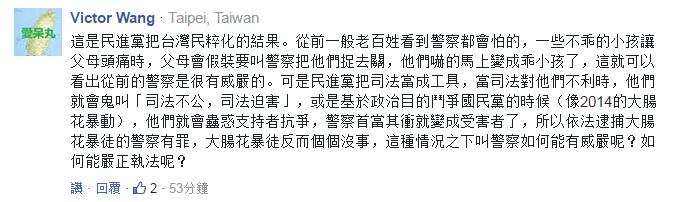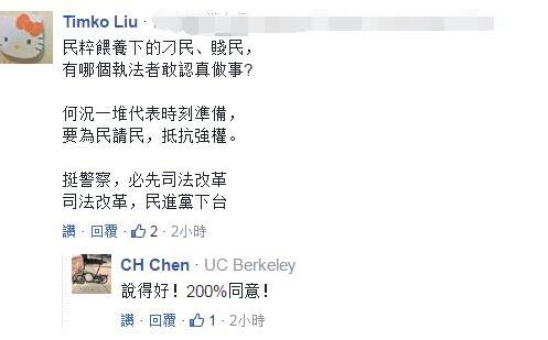 對此,也有臺灣網友發表了自己的看法:挺警察,必先“司法改革”;若想“司法改革”,民進黨就得下臺!