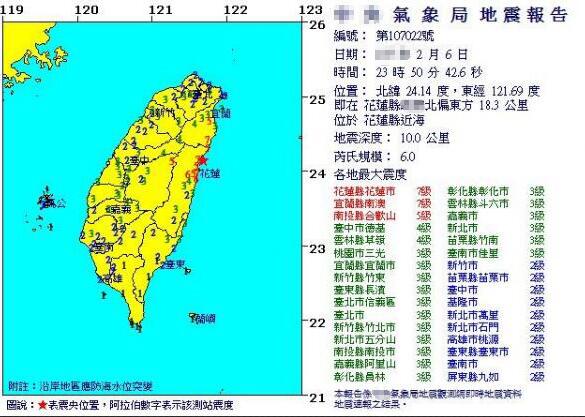 最新消息顯示,中國地震臺網已正式測定,2月6日23時50分在臺灣花蓮縣附近海域(北緯24.13度,東經121.71度)發生6.5級地震,震源深度11千米。而據臺灣“東森新聞云”報道,花蓮6日深夜發生大規模主震后,至今已發生104起余震,最新一起是7日清晨6時11分、規模2.9級的有感地震,花蓮縣有關部門稍早時也宣布7日停班停課。